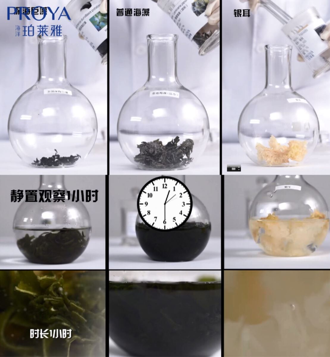 在吸水性测试中,,大嘴博士选取同等质量的海洋原液的原料深海巨藻和普通海藻、、、、银耳进行吸水力测试。。。实验发现深海巨藻可快速吸收自身重量13.3倍的水分,,,,而普通海藻和银耳分别可吸收自身重量5倍和6倍的水。。。实验证明,,,深海巨藻具有超强吸水能力,,,为肌底提供保湿水库。。