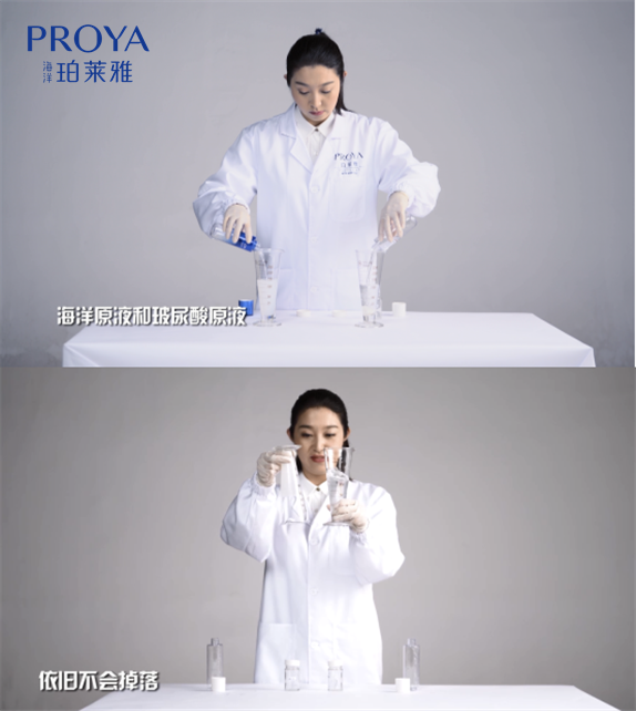 在渗透性测试中,,,将同等毫升量的海洋原液和网红保湿成分玻尿酸原液倒入等量的吸水柔珠中,,,,3分钟后,,,,海洋原液完全被吸水柔珠吸收,,,,呈现出固态;而玻尿酸原液则不能完全被吸收,,,,仍是液态。。。。实验证明,,,,经过冷发酵工艺使得营养小分子化的海洋原液渗透性更强,,嗖的一下,,高效快速地将水分传送直达肌底。。